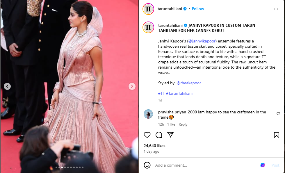 Janhvi Kapoor’s Cannes debut was not just a fashion moment — it was a cultural statement. In choosing to highlight the work of Indian artisans and traditional weaving techniques, she reminded the world of India’s rich heritage, all while embracing her own global stardom.